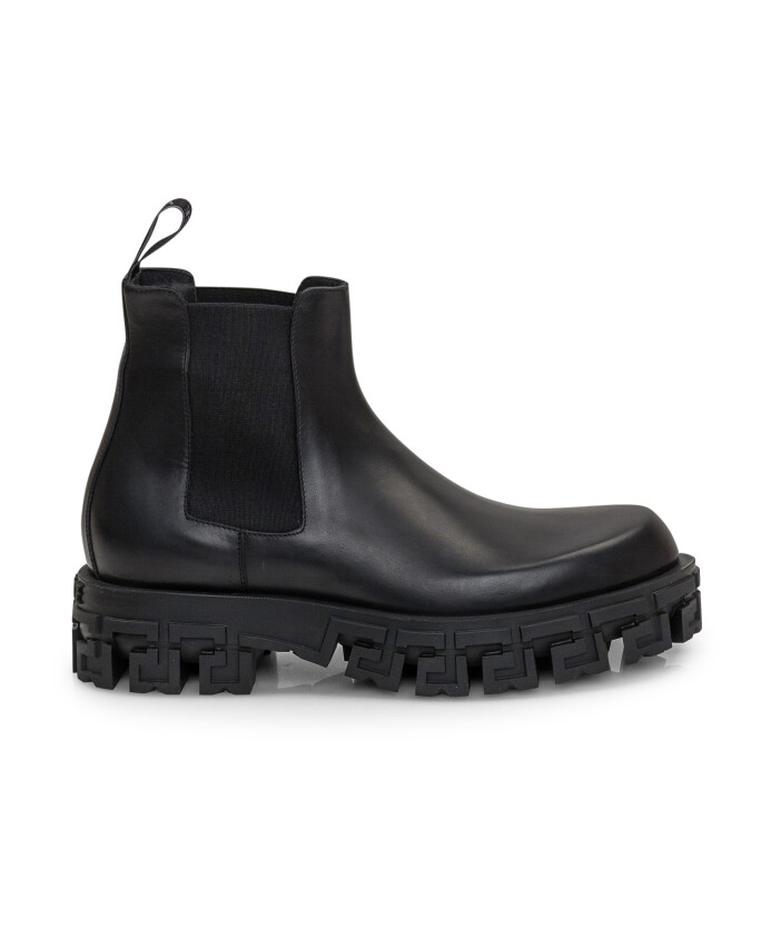 Bottine noire Versace pour homme. Avec inserts élastiques sur les côtés, logo sur le talon et semelle avec motif Greca. Achetez maintenant ces élégantes bottes Chelsea !